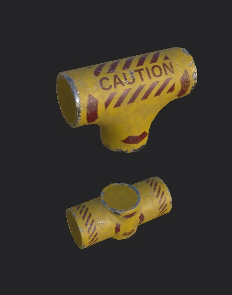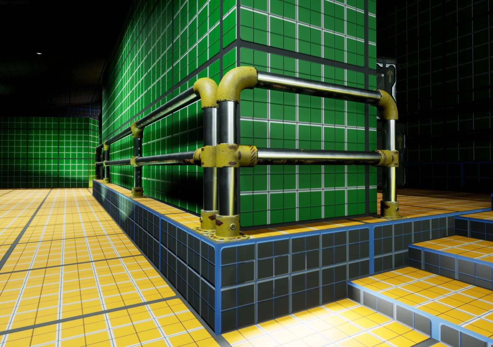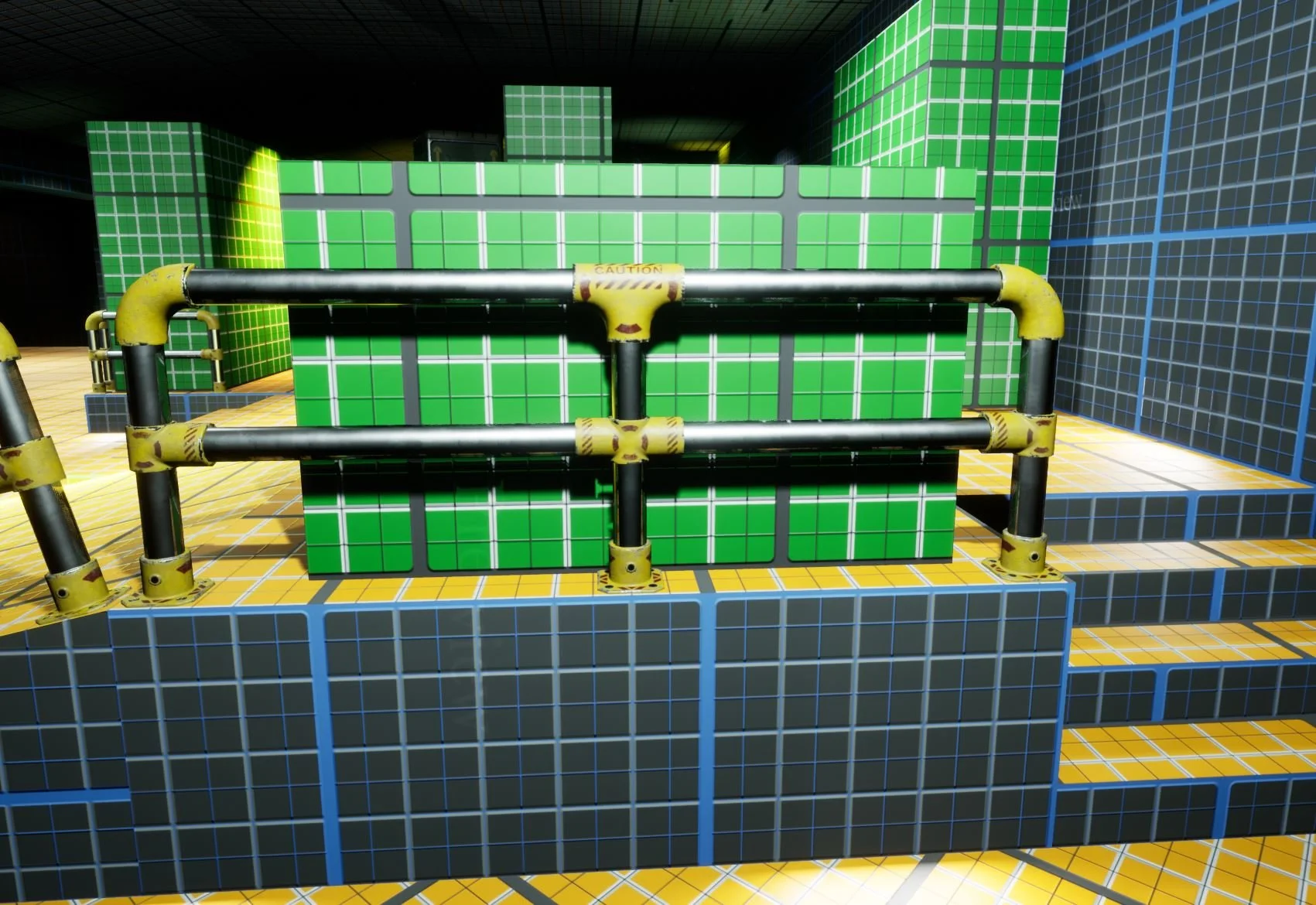 The level blockout called for many instances of safety rails. I opted to create a small set of modular pieces to make rails of any length. The metal bars may be any length to fit the shape with a set of end caps on either side; a T-post piece can then be duplicated along the length of the bars as needed.