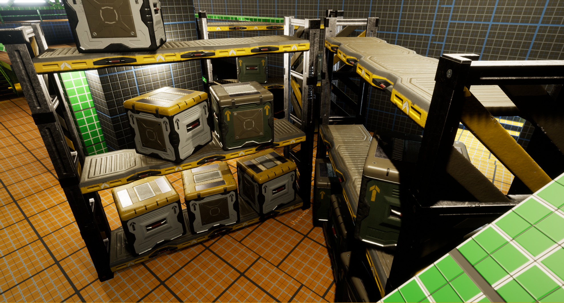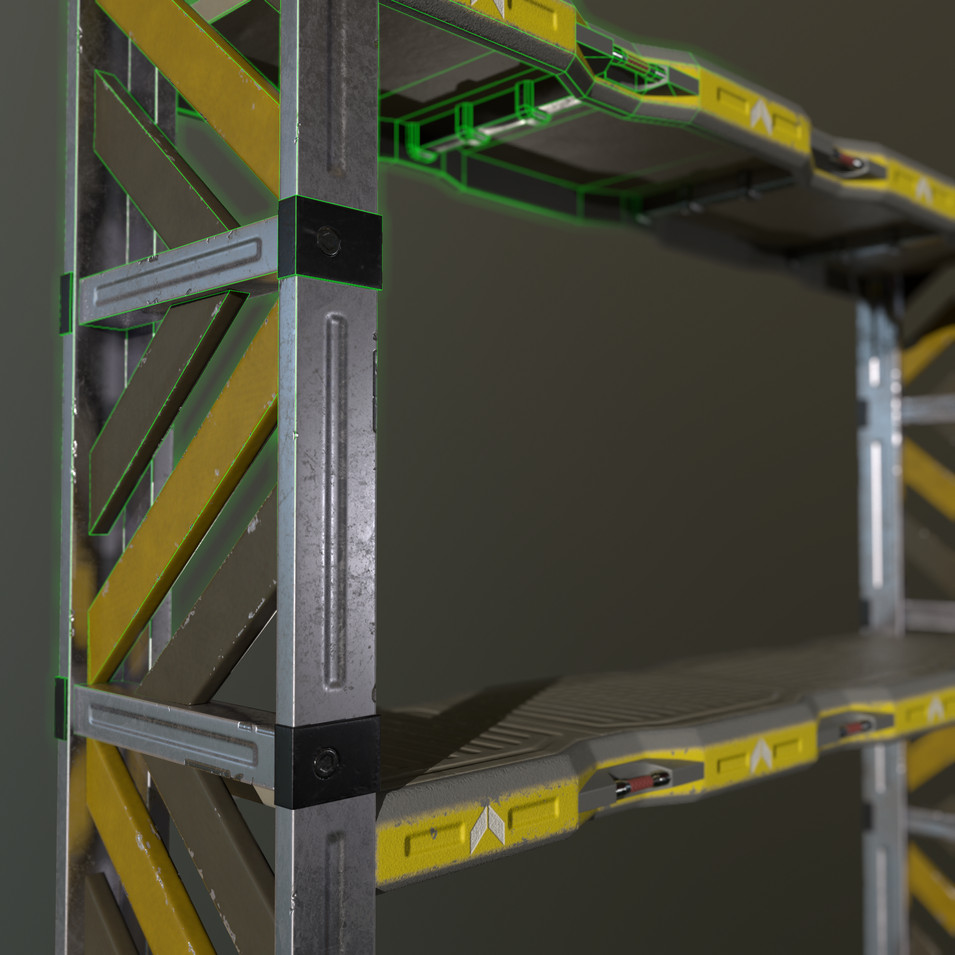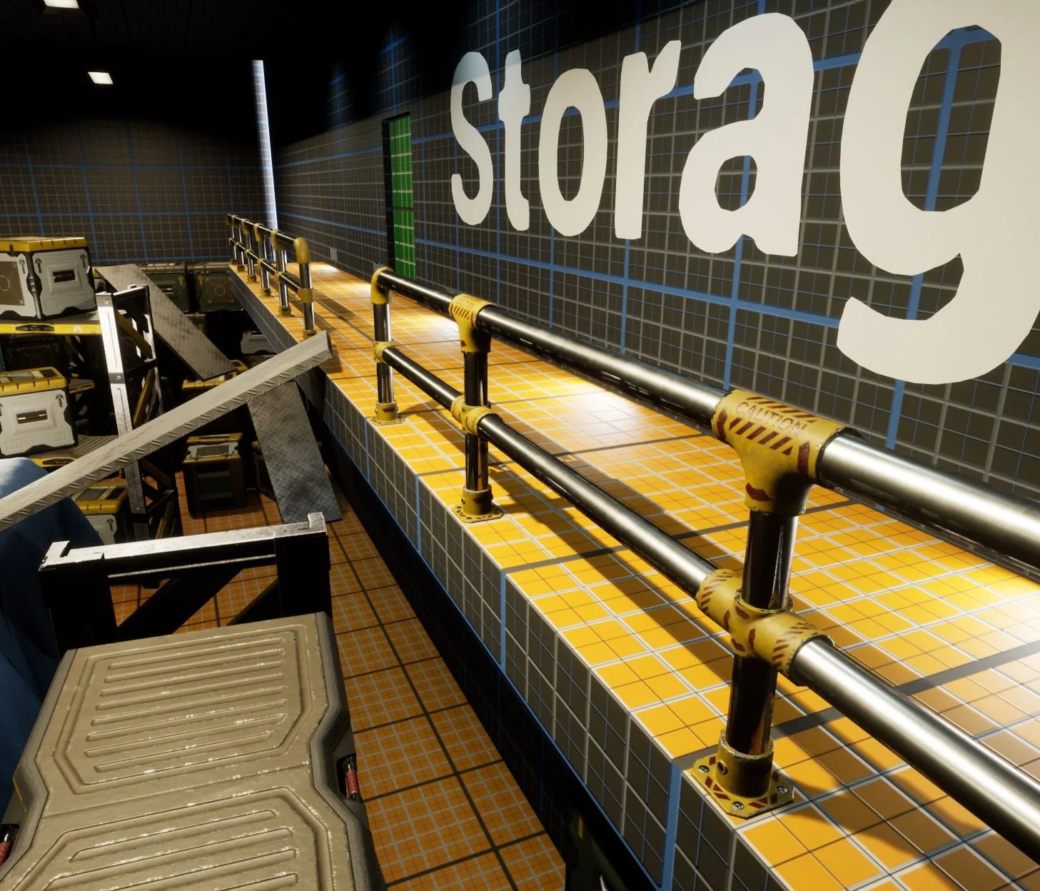 The level blockout called for many instances of safety rails. I opted to create a small set of modular pieces to make rails of any length. The metal bars may be any length to fit the shape with a set of end caps on either side; a T-post piece can then be duplicated along the length of the bars as needed.